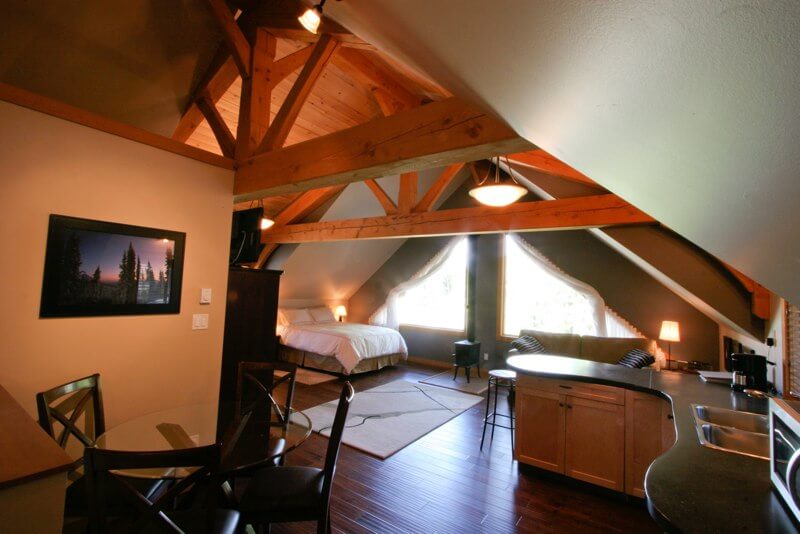 Resting beneath these breath-taking timbers is an open concept, 550 sq ft loft featuring hard wood floors throughout and heated tiles in the bathroom.